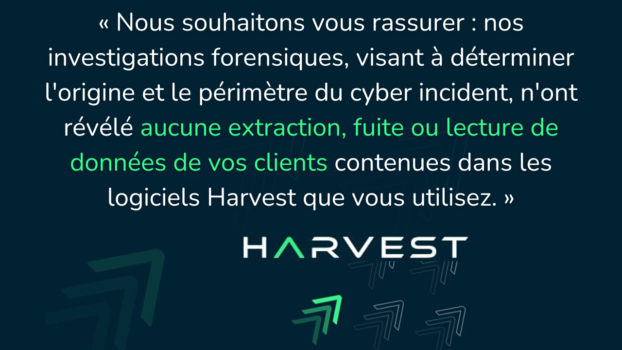 Nous souhaitons vous rassurer : nos investigations forensiques, visant à déterminer l'origine et le périmètre du cyber incident, n'ont révélé aucune extraction, fuite ou lecture de données de vos clients contenues dans les logiciels Harvest que vous utilisez. Nos experts analysent dorénavant les répertoires internes utilisés par nos collaborateurs, hors logiciels Harvest, pour finaliser l'analyse. Nous reviendrons vers vous lorsque cette analyse sera terminée.