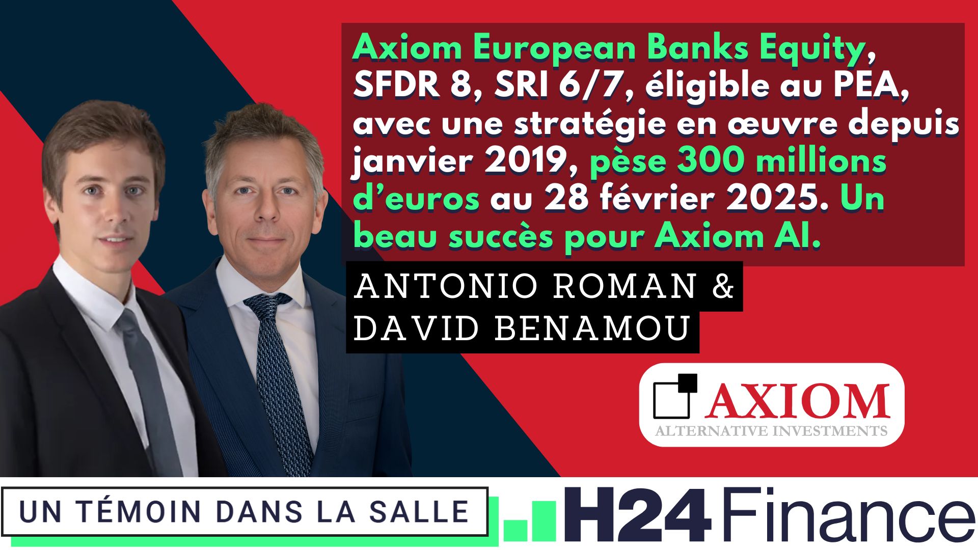 Axiom European Banks Equity, SFDR 8, SRI 6/7, éligible au PEA, avec une stratégie en œuvre depuis janvier 2019, pèse 320 millions d’euros. Un beau succès pour Axiom AI ?